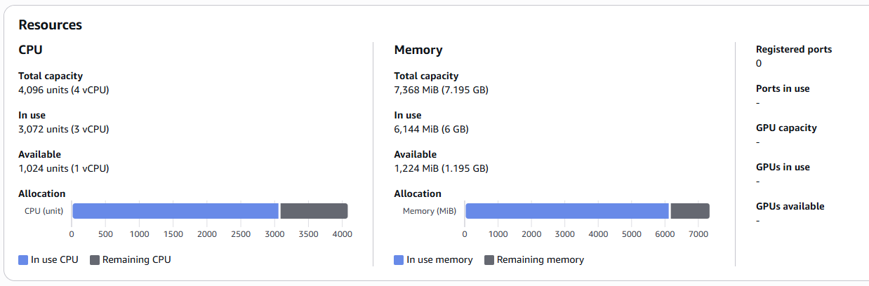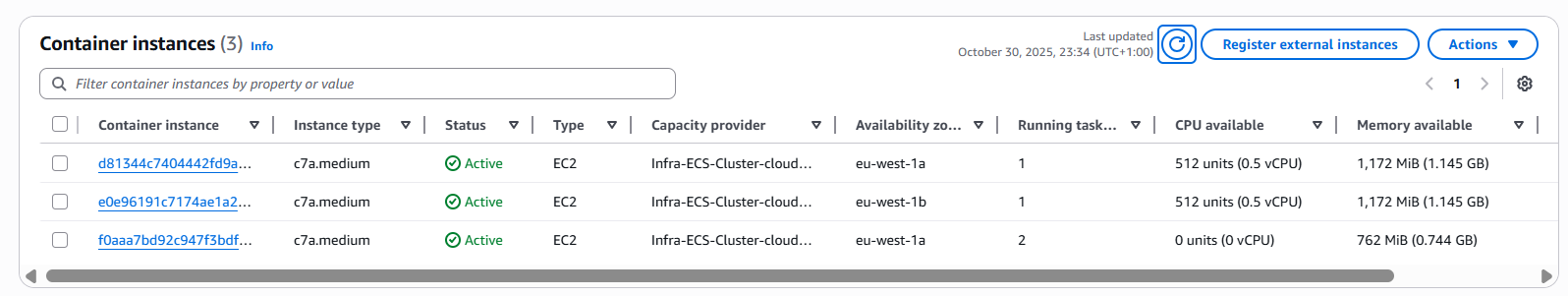 En la imagen superior se observa cómo el sistema distribuye 4 tareas entre 3 instancias activas, manteniendo un equilibrio correcto a nivel operativo, aunque con cierta infrautilización de recursos. La realidad es que las cargas se podían ejecutar en 2 instancias del tipo c7a.medium, una en cada zona de disponibilidad, con el consiguiente ahorro al eliminar una instancia.