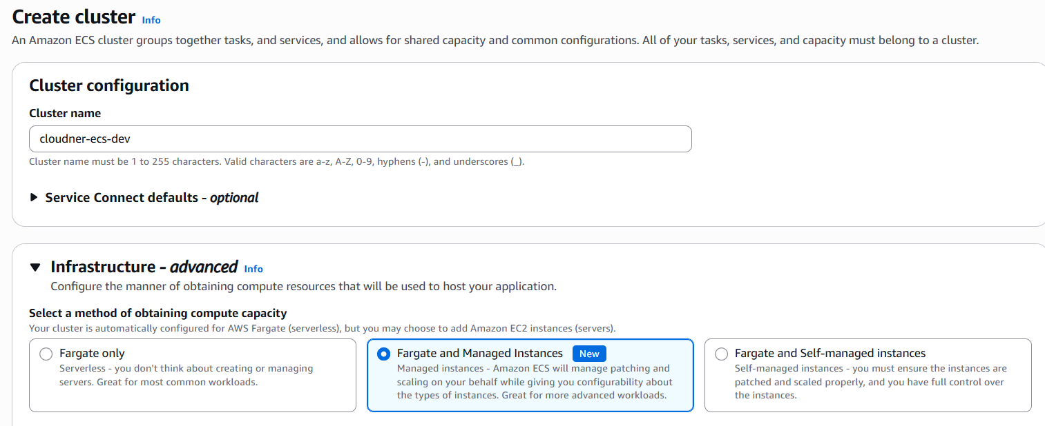 La configuración inicial se realizó usando la opción ECS default para la selección de instancias, de modo que fuese el propio servicio quien eligiera automáticamente los tipos más adecuados en función de los requisitos definidos en la task definition.