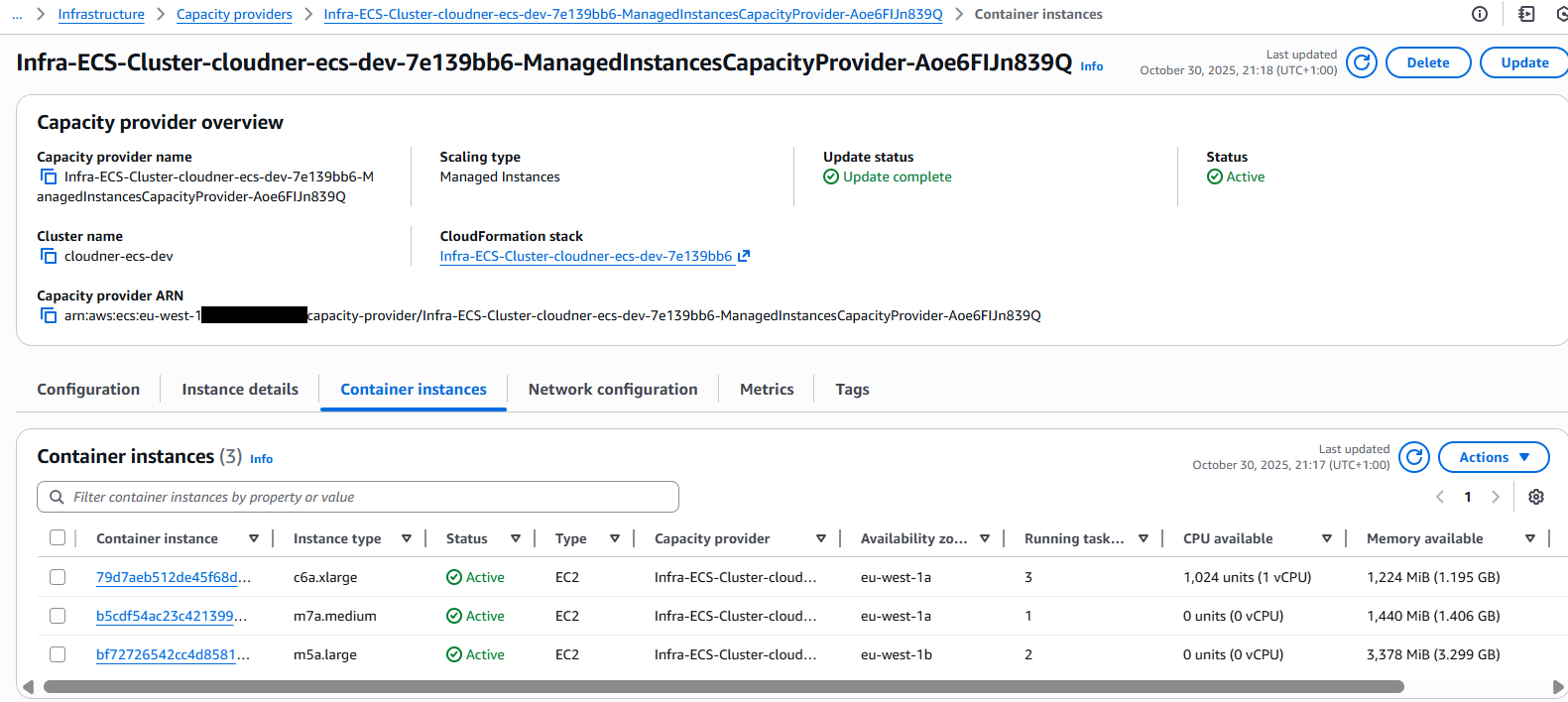Por un lado, ECS Managed Instances ha gestionado de forma completamente autónoma la creación y eliminación de instancias para adaptarse a la capacidad esperada. El escalado ha sido estable, rápido y sin intervención manual. Por otro, la selección de tipos de instancia podría afinarse más. El modo ECS default tiende a elegir combinaciones que funcionan correctamente, pero no siempre maximizan la eficiencia económica.